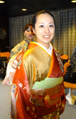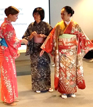 | 堂々と着付けを示範する院生 | コーディネータの通訳による振袖の紹介 | モデル役の院生と 着付け担当の院生 |