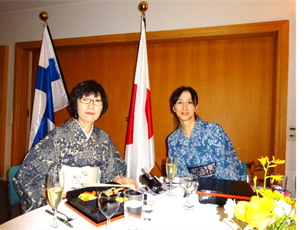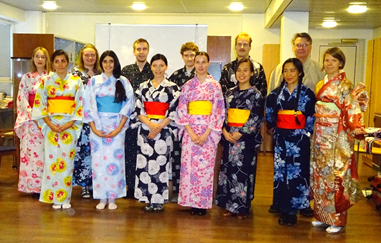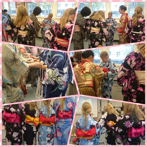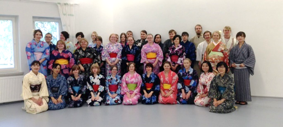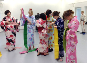 今年度のワークショップは、9月15日から25日まで森や湖など自然豊かなフィンランド共和国で開催しました。参加メンバーは、横浜国立大学から薩本弥生先生はじめ院生3名と埼玉大学から私と院生1名の6名でした。ヘルシンキでは在フィンランド日本国大使館で一般市民・学生、大使公邸においてはInternational Women's Club,Helsinkiの外交夫人、その後国鉄で移動しヨウツェノ学院では日本語やその他の外国語を学ぶ学生、さらにフィンランドの中部に位置するオウルに飛び、横浜国立大学との提携校University of Ouluの大学生とOulu International Schoolの生徒たちを対象としました。ワークショップでは総計190人にきものの講義の後、浴衣の着装を楽しんでいただきました。
