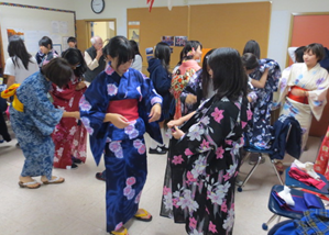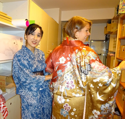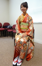 | 着装に取り組む参加者 | 浴衣姿のLin先生とMinakoさん 振袖モデルとなった学生 |
