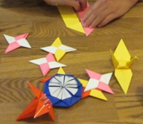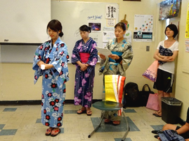 Grade 7の生徒に合わせて、急きょ後発組が小さめの浴衣を追加で運搬しました。平成23年度イギリスWSで行った手裏剣の折り紙ワークを組み込みながら、きものの畳み方を実演しました。アニメを通して生徒たちは忍者へのなじみも深く、大いに盛り上がりました。