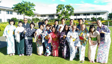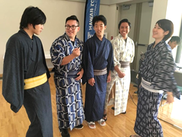 ハワイ大学では、受け入れ先のShu-Hwa Lin先生とMinako McCarthy様に教室の手配や宣伝等でお世話になり、2回のワークショップを開催しました。大学生と近隣のきものに興味の高い方々に参加いただきました。