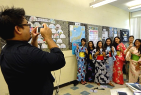 サンフランシスコのWest Portal Lutheran School, South San Francisco High School, San Francisco State Universityの3校でワークショップを開催しました。 本研究室からは学生と関係者総勢11名が出向き、ゆかた運搬も一部担当しました。 ワークショップの合間には授業を見学させてもらい、日本の学校との違いを感じとることができました。 協力校との橋渡しをして下さった惠さんは、ビジティングスカラーとしてUC Davisと SFSUに留学した時以来の友人です。学生たちが惠さんの御嬢さんに振袖を着せてあげると、とても喜んでくださいました。