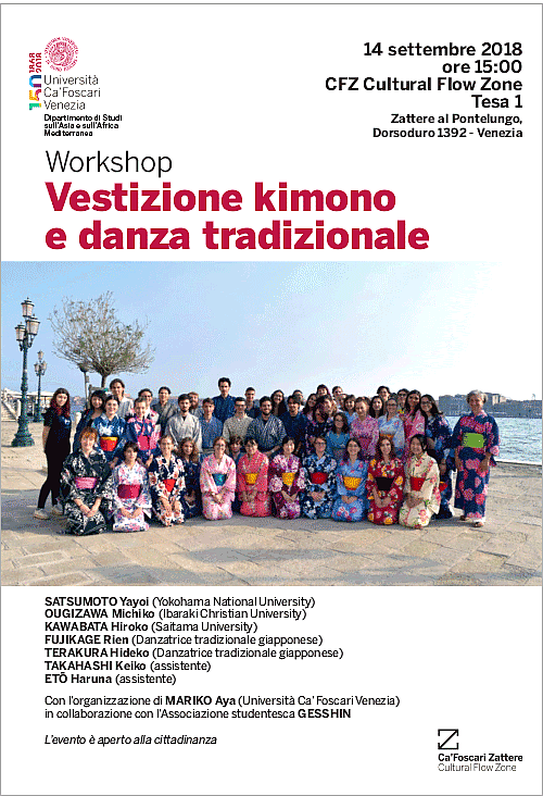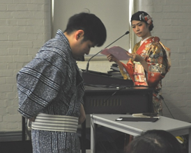薩本研究室が、日本の伝統的模様に焦点を当てた新プログラムを開発し、内容の充実度が増しました。本研究室から参加の院生2名は振り袖と紋付・羽織袴姿で登場して注目を集め、ゆかた着装のデモンストレーションと解説を分担しました。