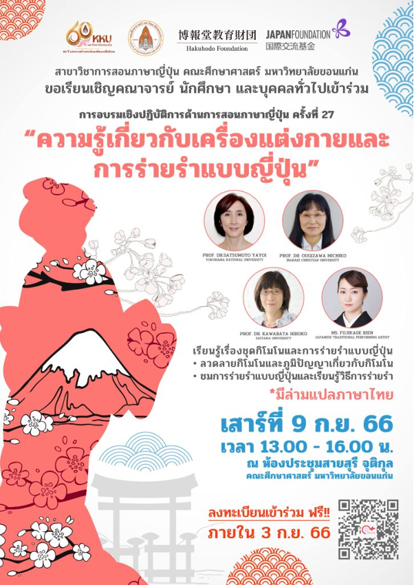 2019年以降、海外ワークショップは5年間中断となりました。今年度、「きもの」文化を海外へ発信するための国際交流活動プログラムの実践のため、3大学の教員(横浜国立大学 薩本弥生先生、埼玉大学 川端博子、茨城キリスト教大学 扇澤美千子先生)と日本舞踊家 藤蔭里燕さん、学生など10名がタイを訪問しました。久しぶりの海外での活動再開のため、2018年に第12回目ワークショップを開催したコンケン大学に受け入れをお願いしました。コンケン大学は17学部を有するタイ国東北地方最大の国立総合大学です。教育学部日本語教育プログラムの日本語教師 高橋美紀先生と、プログラム長Dr.Watchara Suyara先生より、万全の受け入れと厚いもてなしを頂きましたこと、お礼を申し上げます。初日のワークショップでは広いホールを用意いただき、一般公開講座として初等中等高等教育機関教員など約350名を対象に、きもの文化の講義と、里燕さんによる日本舞踊のレクチャーと「梅」の演舞を披露した後、見立ての体験をしてもらいました。2日目は日本語教育課程の学生さんたち約30名を対象に、ゆかたの着装と日本舞踊の見立て体験ワークショップを開催しました。ワークショップの様子をビデオにまとめましたのでご覧ください。