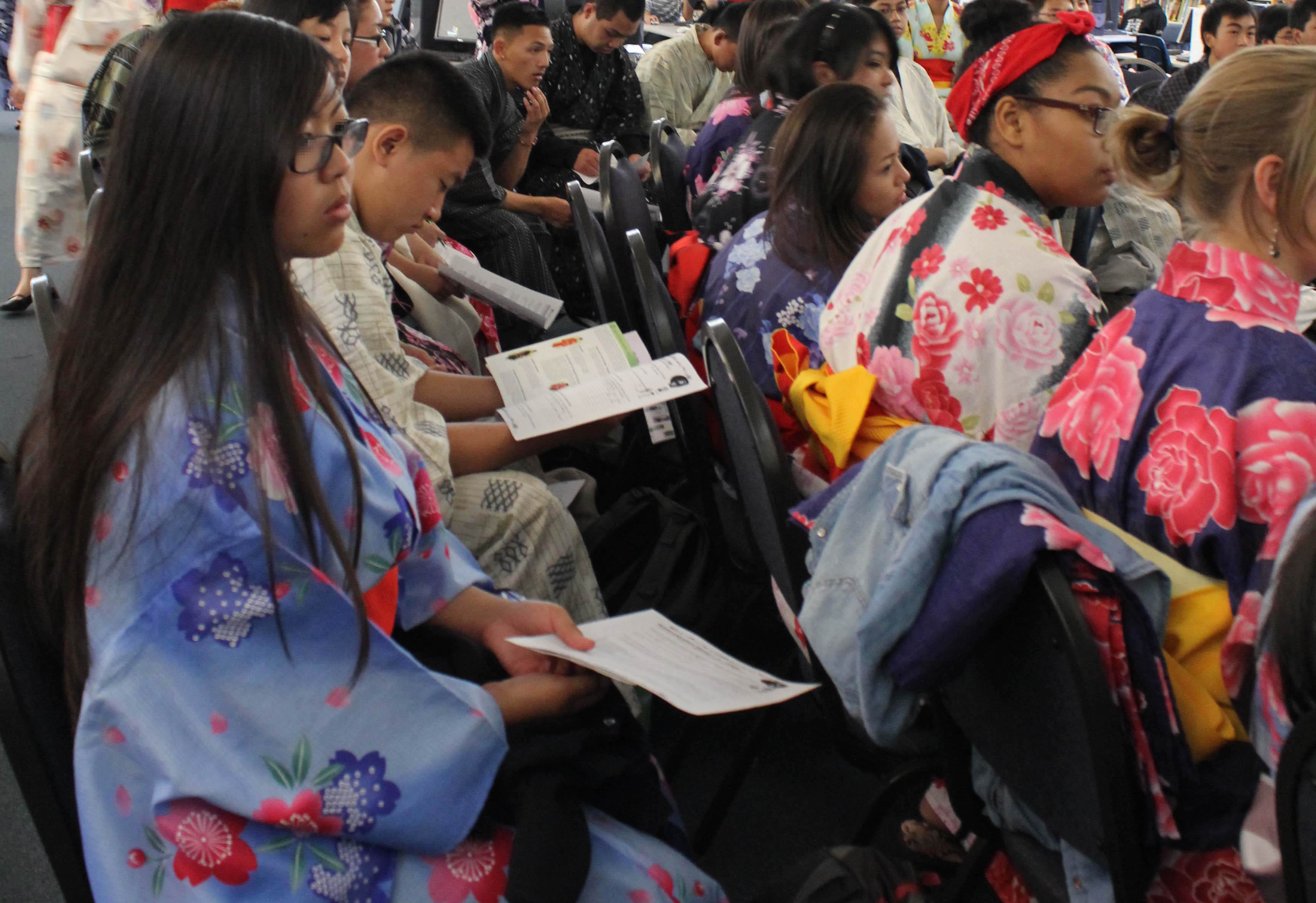 HTICはオワフ島西部のカポレイ市にある東海大学のキャンパスです。鶴見剛学長室長が、地元の高校、University of Hawaii at West Oahuほか近隣住民に積極的に宣伝してくださいました。当日はHTICの吉村卓也学長はじめ、在ホノルル日本国総領事館の三澤康総領事ご夫妻、ハワイ大学西オアフ校のドリス・チン学長にもお越しいただき、広々とした会場をお借りして盛大に開催できました。着装終了後、手裏剣や鶴などの折り紙を楽しんでいただきました。